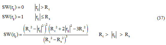 To further reduce the cost of computing the entire electrostatics, a multiple time stepping integration scheme [Allen and Tilsedley,1987] is used. In this scheme, the total force acting on each atom is broken into two pieces, a quickly varying local component and a slower long range component. The local force component is defined in terms of a splitting function given by equation 37: