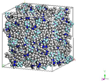 Initial configurations were generated by randomly inserting cation-anion pairs into the simulation box. To prevent overlap, an insertion was rejected if any of the newly inserted atoms were within 1.0 Å of any existing atoms. The initial structures are generated through the use of PACKMOL [Martínez and Martínez, 2003] ( http://www.ime.unicamp.br/~martinez/packmol/) .For all the simulations, the initial cell volume was chosen to be of lower density. For [Bmim][PF6] the cubical cell of 125 cation-anion pairs is shown in Figure 2.This step includes the creation of the PDB file (Protein Data Bank).This file stores the coordinates of all 5500 atoms in the cell. For showing the connectivity of bonds, angles, dihedrals and impropers the PSF file (Protein Structure File) is created using VEGAZZ [Pedretti et al.,2002]( http://nova.colombo58.unimi.it/cms/index.php?Software_projects:VEGA_ZZ) . The PSF, PDB and the force filed file are given in Appendix A.