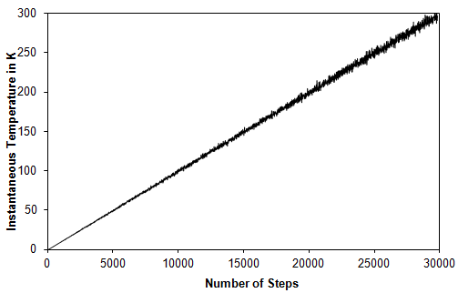 During this stage the temperature of the system is linearly increased from 0 K to the required temperature within a specified time. At each integration step velocities are drawn from a Maxwell distribution and the temperature is incremented by 0.01 K. (Fig 3).
