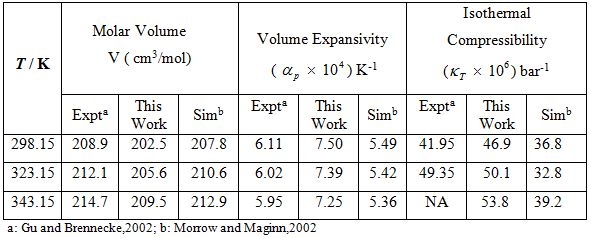 The volume expansivity is computed by running a series of NPT simulations at the same pressure i.e 1 atm but at temperatures (T = 298.15, 323.15, 343.15). Because the change of volume with temperature is approximately linear, it can be calculated by fitting a straight line to the simulated molar volume data at different temperatures. The volume expansivity decreases with temperature which is a good agreement with literature.