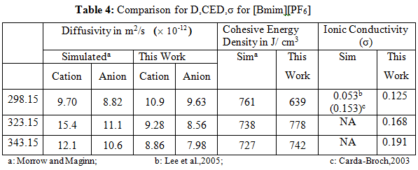Additionally the cohesive energy densities, cation and anion diffusivities and ionic conductivities have been determined using equations given in the earlier modules respectively. Comparison with the simulated results of Morrow and Maginn, (2002) is given in Table 4.