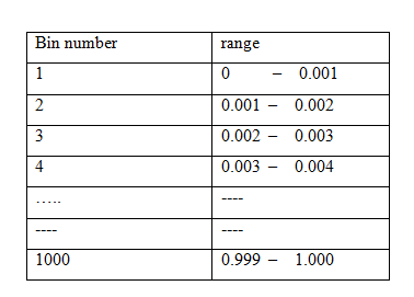 Bin1 for the range of 0 to 0.001, bin2 for the range of 0.001 to 0.002, etc. At the end of the experiments, plot the histogram for the range of random numbers and the population (i.e., total number of random numbers collected in that bin). It should generate a flat histogram, emphasizing the uniformity of the generator.