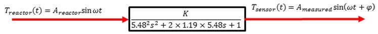 From the reported results, we can conclude that some disturbance in the reactor has caused the actual temperature to vary sinusoidally which eventually has caused the measured output to oscillate too. The temperature sensor and the thermowell act as a two first order processes in series. The overall transfer function between actual temperature of CSTR and measured value of the temperature is:
