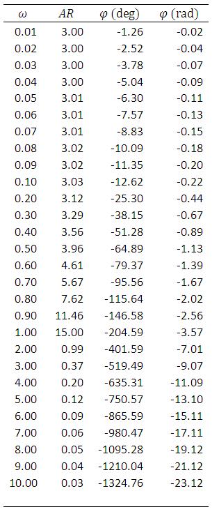 Following table is prepared for a frequency range 0.01≤ ω ≤10 using eqn. (1) and (2).