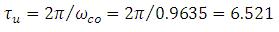 Solving for ωco, we obtain ωco = 0.9635 and AR at the crossover frequency is 14.59, hence the ultimate gain, Ku=1/14.49=0.0685 and ultimate period of oscillation,