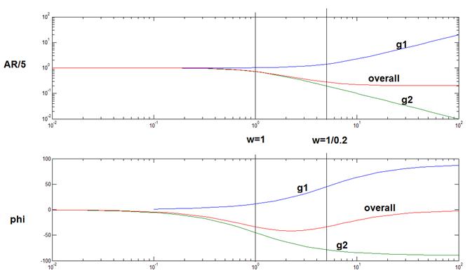 Hence there will be a low frequency asymptote parallel at AR = 1 and high frequency asymptote approaching ∞ with a slope of 1. Phase shift will be positive, hence called the phase lead from 0° to 90°. It has two corner frequencies at 1 and at (1/0.2). The qualitative Bode diagram is given below with the following notation: