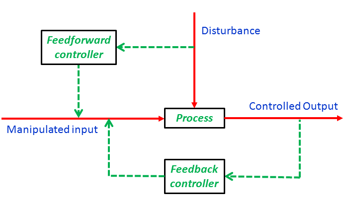 Fig V.2 shows the general form of a feedforward control system. It directly measures the disturbance to the process and anticipates its effect on the process output. Eventually it alters the manipulated input in such a way that the impact of the disturbance on the process output gets eliminated. In other words, where the feedback control action starts after the disturbance is “felt” through the changes in process output, the feedforward control action starts immediately after the disturbance is “measured” directly. Hence, feedback controller acts in a compensatory manner whereas the feedforward controller acts in an anticipatory manner.