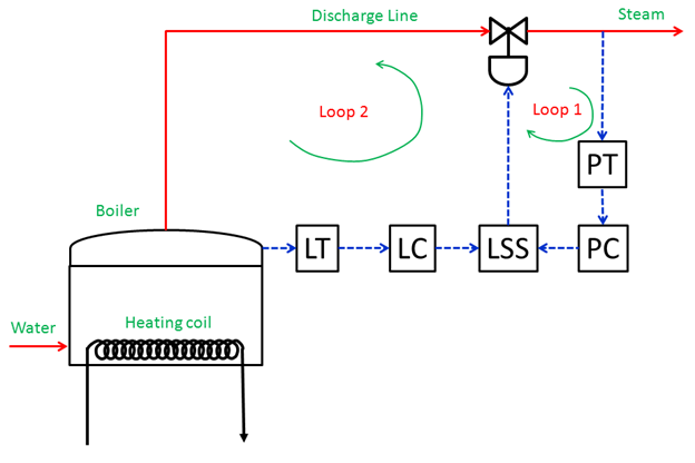 Consider a boiler shown in the Fig V.12 It has one water inlet and one steam outlet. The steam outlet is regulated by the valve in the discharge line that takes the control signal from the control mechanism in Loop1 (pressure transducer and pressure controller). In other words, the discharge of steam is regulated on the basis of its pressure desired in the supply line elsewhere. However, the water is boiled using a heating coil that needs to be always submerged below the water level so that the heating coil does not burn out. Hence, in order to ensure a certain minimum level of water inside the boiler, the control Loop 2 is set in place that contains a level transducer and a level controller. Both level controller and pressure controller give the control signal to the valve through an intermediate switch LSS (Low Selection Switch) that takes the preferential signal from the level controller. In other words, Loop 2 remains inactive during the normal operation and the Loop 1 regulates the process. Nevertheless, at critical situation when the water level drops below the minimum allowable limit, the Loop 2 takes over and takes corrective measures.