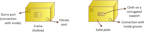 - Consists of series of plates and frames sandwitched alternatively; cakes are built-up inside the frame–clamber. Cloth, filtering medium, is supported on a corrugated material. There are slurry and filtrate ports.