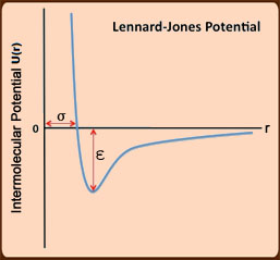 Figure 27.1: The Lennard-Jones potential defined by the two parameters, s (particle diameter) and e (well-depth). The deeper the well-depth e, the stronger is the interaction between the two particles. |