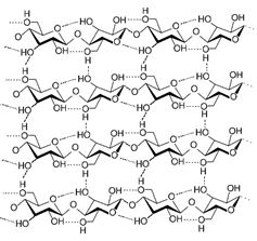 Hydrogen bonds in Sugar: A strand of cellulose (conformation Iα), showing the hydrogen bonds (dashed) within and between cellulose molecules.