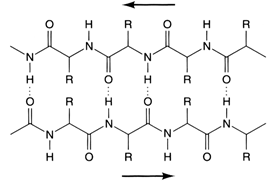 Diagram of β-pleated sheet with H-bonding between protein strands