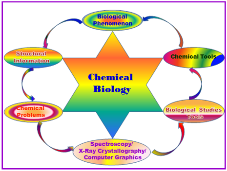 - The field is primarily concerned with research at the interface of Chemistry and Biology. But in practical sense it is largely focused on small molecules as research tools and potential therapeutics. The crucial part of the work in Chemical Biology is the design and synthesis of small molecules and screening of these with bioassays by utilizing instrumentation of chemistry and biology. It takes the helps of all established field in sciences and biosciences including efficient methods for the synthesis of large numbers of compounds, characterization tools, computational structure-activity relationship, and high-throughput screening in bioassays. Thus the chemical biology is important approach for combating disease such as Cancer, Neurodegenerative diseases, Inflammation and many others.