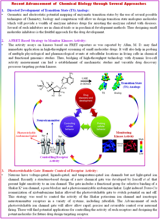 Exploring the many existing small biological compounds and designing several enzyme inhibitors will also provide essential mechanistic probes and new candidates for drug discovery. Thus, many of such molecules showed and will continue to show the capability of targeting to an entire proteome. Also, the development of robust chemical/bio-chemical tools to probe and to investigate cellular principles at molecular levels will be of great achievement toward the success of conceptual approach, the Chemical Biology and thus, will facilitate the development of new therapeutics for treatment of diseases.