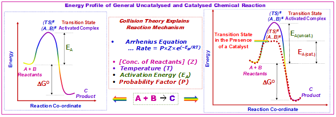 In general, catalysts work by providing an alternative pathway which involves a different transition state of lower activation energy compared to an unanalyzed reaction. Consequently, more molecular collisions have the energy needed to reach the transition state. Hence, catalysts enable reactions that would otherwise be blocked or slowed by a kinetic barrier. The catalyst can increase reaction rate. It can enhance selectivity, or the reaction proceeds at lower temperatures in presence of a catalyst.