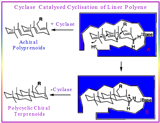 The following facts are also further clear from the general process of cyclase cyclization of linear polyenes as well as from the squalene biosynthesis: