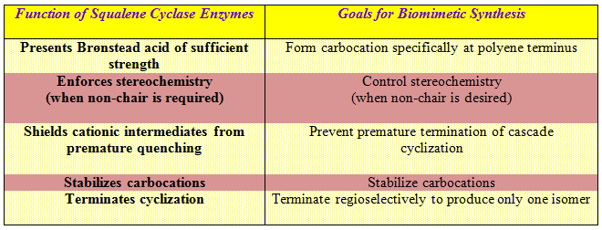 Corey et al. have correlated nicely between the function of squalene cyclase enzymes and the goals for biomimetic synthesis as has been stated below (Wendt, K.U.; Schulz, G.E.; Corey, E.J.; Liu, D.R. Angew. Chem. Int. Ed. 2000, 39, 2812-2833.)
