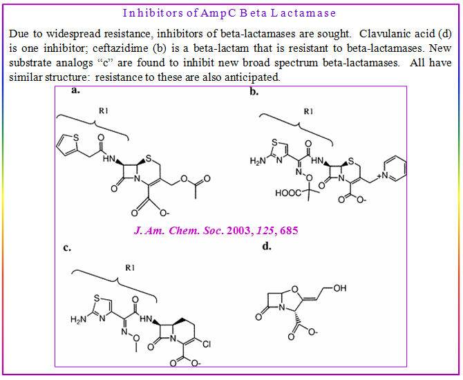 The resistance to β-lactam antibiotics occurs via hydrolysis of β-lactams by β-lactamase. While the acyl−enzyme intermediate in d-Ala-d-Ala carboxypeptidase is stable, the β-lactamase acyl−enzyme intermediate hydrolyzes at rates of 100−4000 s-1. However, several naturally occurring β-lactams, including clavulanate, tazobactam, and sulbactam, form kinetically stable acyl−enzyme intermediates and inactivate β-lactamase. These drugs are used to overcome β-lactamase resistance.
