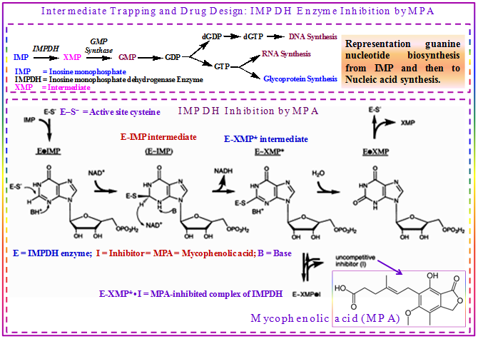The trapping of reaction intermediate is another mechanism for the formation of covalent inhibitory complexes between the enzyme and inhibitor. Inosine monophosphate (IMP) dehydrogenase and DNA topoisomerase fall in this category. Inosine monophosphate dehydrogenase catalyzes the oxidation of IMP to XMP through the formation of a covalent cystinyl intermediate at C-2 of the purine ring. Mycophenolic acid, an uncompetitive inhibitor, binds in the NAD cofactor site, and prevents the hydrolysis reaction, thus trapping and stabilizing the covalent E−XMP complex. The structure of the trapped complex shows that the bicyclic ring system of mycophenolic acid packs underneath the hypoxanthine ring of XMP, thereby preventing release of the intermediate.