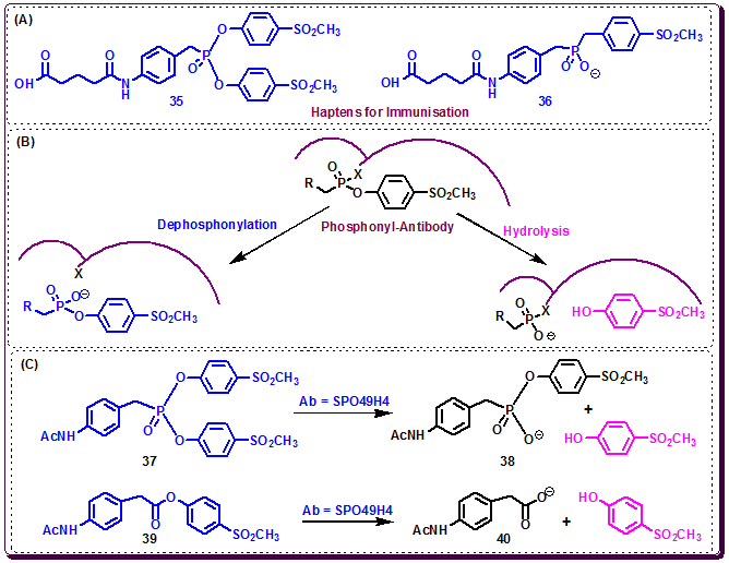 Thus, to explore this strategy, in 1995 Janda, Lerner and co-workers designed an organophosphorus diester hapten 35, as the primary reactive immunogen to elicit catalytic antibody to perform a chemical reaction in the antibody-combining site during immunization. This hapten can be either hydrolyzed at physiological pH or trapped by a nucleophile at the B-cell level of the immune response affording the monoester 36, an analog of the transition state (Figure 3.38A). Nineteen monoclonal antibodies (mAbs) were isolated, out of eleven were able to catalyze the target acyl-transfer reaction, hydrolysis of phosphonate diester 37 to generate the monoester 38 (Figure 3.38C). Amongst these eleven catalytic antibodies, SPO49H4 demonstrated the best catalytic activity. It effectively catalyze the hydrolysis of the activated ester 39 to yield carboxylic acid 40 with a kcat of 31 min−1 and a rate acceleration (kcat/kuncat) of 6700 at pH 8.0.