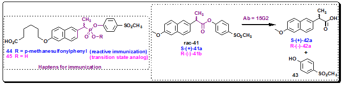 The first direct comparison between reactive immunization and transition state analog hapten for catalytic antibody production was demonstrated by comparing esterase antibodies elicited against a TSA, phosphonate monoester 45, with the hapten raised by a reactive immunogen, phosphonate diester 44. Thus, hapten 44 was initially design for the purpose of resolving a racemic mixture of naproxen esters. Antibody 15G2 generated by using hapten 44 (reactive immunization) catalyzed the homochiral production of the anti-inflammatory agent Naproxen, rac-42, from 41. The S-(+)-enantiomer 42a of naproxen is formed 28 more times than the R-(−)-enantiomer 42b (Figure 3.39). This antibody catalyzed the hydrolysis of S-(+)-41a and gave S-(+)-42a with a kcat = 28 min−1, Km = 300 μM at pH 8.0, and kcat/Km = 9.3 × 104 M−1 s−1. On the other hand, antibody 6G6, raised against the transition state analog hapten 45, catalyzed the same reaction with a kcat = 81 min−1, Km = 890 μM at pH 8.0, and kcat/Km = 4.5 × 104 M−1 s−1. The transition state analog approach provided good biocatalysts in terms of turnover numbers and enantiomeric discrimination, but it suffers from varying degrees of product inhibition by phenol 43. Therefore, the antibody generated via Reactive immunization are more efficient and do not suffer from product inhibition.