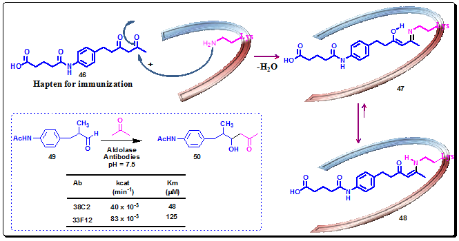 The reactive immunization strategy has also been utilized in the aldol reaction. Two aldolase antibodies, 38C2 and 33F12, were elicited by hapten 46, equipped with a reactive β-1,3-diketone functionality. The β-1,3-diketone moiety demonstrated its distinct ability to trap a lysine side chain amine affording an enaminone 48 through Schiff base 47, which directly participates in the mechanism of the aldol reaction in the active site of the antibody (Figure 3.40). The two antibodies, 38C2 and 33F12, obtained by reactive immunization performed extraordinary catalysis of the aldol reaction between acetone and the aldehyde 49, with high catalytic proficiency (Figure 3.40).