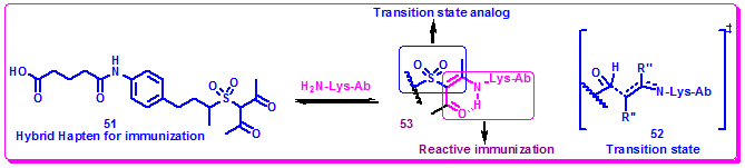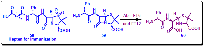 Mechanism-based inhibitors covalently react with the active site in target proteins and inhibit their activities. Therefore, such inhibitors provide a wealth of information to guide the design of haptens for immunization for generating catalytic antibodies. Penam sulfones are potent mechanism-based inhibitors of β-lactamase. They by forming an acyl-enzyme intermediate inactivate the enzyme. Therefore, this efficiency of sulphones inspired the design of the sulfone hapten 58 targeting the hydrolysis of the lactam functionality built in the substrate 59. Immuno conjugate 58-KLH was immunized, and a scFv library was constructed using the spleen cells of immunized mice. Screening of the library yielded two scFv antibodies, FT6 and FT12. These antibodies catalyzed hydrolysis of 59 with rate accelerations (kcat/kuncat) of 5200 and 320, respectively (Figure 3.43).