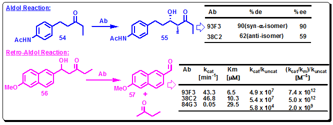 Zong et al. employed reactive immunization strategy in combination with transition state theory to find more efficient aldolase antibodies. Thus, on the basis of hapten 46, a hybrid, hapten 51, was designed, employing a sulfone functionality to establish the tetrahedral motif that present in the transition state, and a β-diketone for trapping a lysine side chain at the active site (Figure 3.41). Two aldolase antibodies, 93F3 and 84G3 were isolated. In the aldol reaction of 54 with 3-pentanone, antibody 93F3 provided syn-aldol 55 with 90% de and 99% ee, while antibody 38C2, elicited to hapten 46 afforded only 62% de and 59% ee. Antibodies 93F3 and 84G3 showed a 103-fold increase in proficiency over the antibody 38C2 for the kinetic resolution of (±)-56(Figure 3.42) [Zhong, G. F.; Lerner, R. A.; Barbas, C. F. Angew. Chem., Int. Ed. 1999, 38, 3738].