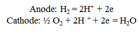 Hydrogen is split into two hydrogen ions (H+), which pass through the electrolyte to the cathode, and two electrons which pass through the external circuit (electric load) to the cathode.
