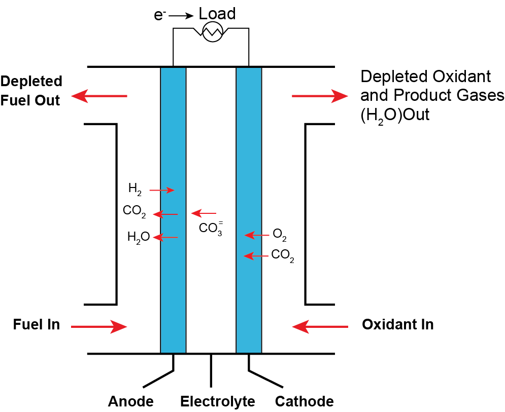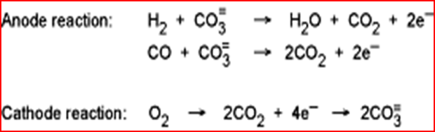 The cathode process combines oxygen and CO2 from the oxidant stream with electrons from the cathode to produce carbonate ions which enter the electrolyte.