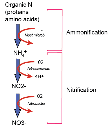 Nitrifiers such as Arthrobacter (heterotroph), Aspergilli’s (heterotroph), and Nitrosomonas (autotroph) are delicate organisms and extremely susceptible to a variety of inhibitors. They are extremely slow growing, unlike many bacteria that can double their numbers every hour or so. In order to thrive, nitrifying bacteria need a relatively clean environment with a steady supply of ammonia and oxygen.