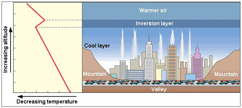During daylight hours, the sun warms the ground which warms the air near the Earth's surface. The warm air rises as more dense cool air displaces it. Any pollution in the air normally disperses in the turbulence caused by the mixing of the air. When a layer of cool air traps the layer of warm air near the Earth's surface, then the situation is known as a temperature inversion. In this case, pollutants are not dispersed but continue to build up in the still, stagnant air.