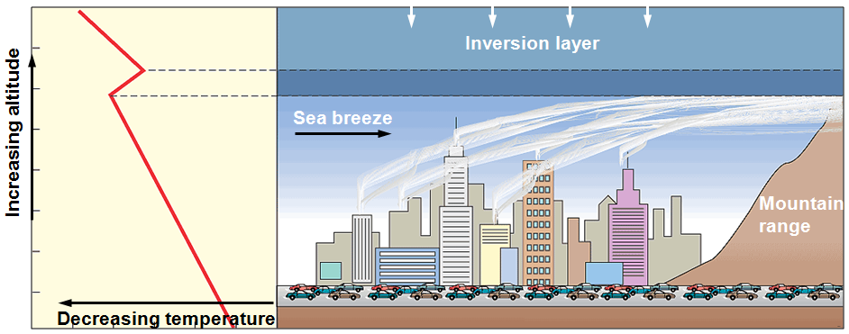 Sea breezes keep the air and pollution onshore, and the mountains prevent the air from escaping. The cold air aloft acts as a lid.