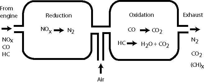 These gases then pass out of the first chamber of the converter and into the second chamber, which usually contains a platinum/palladium catalyst.
