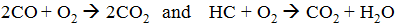 Carbon monoxide is converted to carbon dioxide and any remaining unburned hydrocarbons are converted to carbon dioxide and water: