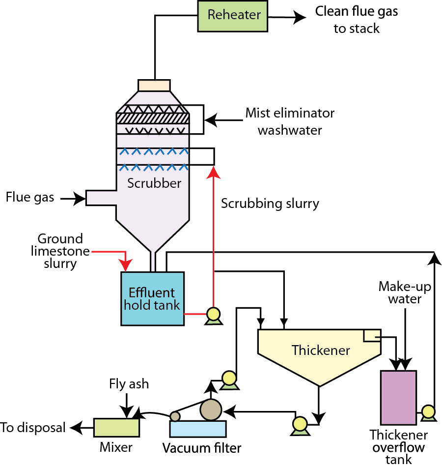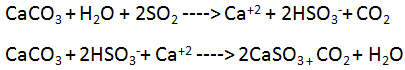 Limestone slurry is sprayed on the incoming flue gas. The sulfur dioxide gets absorbed The limestone and the sulfur dioxide react as follows :