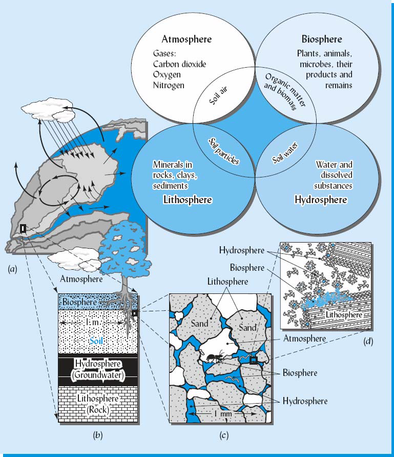 The pedosphere—interface of the worlds of rock (the lithosphere), air (the atmosphere), water (the hydrosphere), and life (the biosphere)—can be understood at many different scales. At the kilometer scale (a), soil participates in global cycles and the life of terrestrial ecosystems. At the meter scale (b), soil forms a transition zone between the hard rock below and the atmosphere above—a zone through which surface water and groundwater flow and in which plants and other living organisms thrive. At the millimeter scale (c), mineral particles form the skeleton of the soil that defines pore spaces, some filled with air and some with water, in which tiny creatures lead their lives. Finally, at the micro- and nanometer scales (d), soil minerals (lithosphere) provide charges, reactive surfaces that adsorb water and cations dissolved in water (hydrosphere), gases (atmosphere), and bacteria and complex humus macromolecules (biosphere). (Diagram courtesy of R. Weil) |