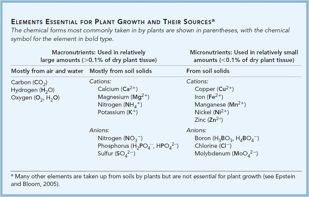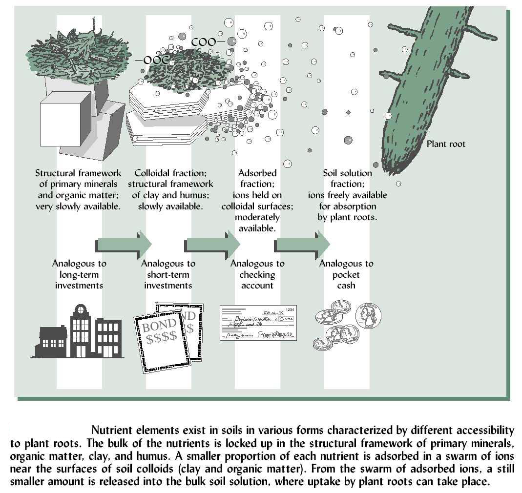 The fertility of a soil is determined by how many kinds and how much nutrients it has stored and is able to supply. Nitrogen (N) mostly in the form of nitrate (NO3-) or ammonium (NH4+), phosphorus (P in the form of H2PO4- or HPO4-), and potassium (K as K+) are three often mentioned soil nutrients important for the growth of plants.