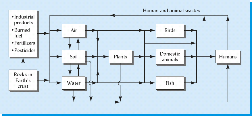 Sources of heavy metals and their cycling in the soil–water–air–organism ecosystem. It should be noted that the content of metals in tissue generally builds up from left to right, indicating the vulnerability of humans to heavy metal toxicity.