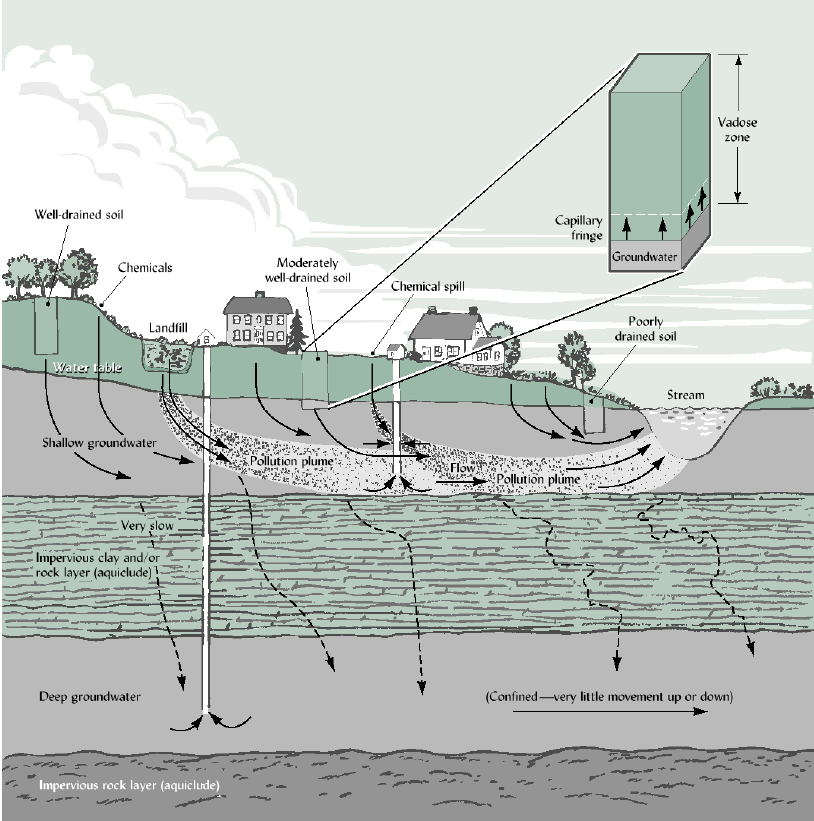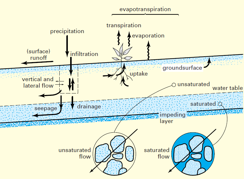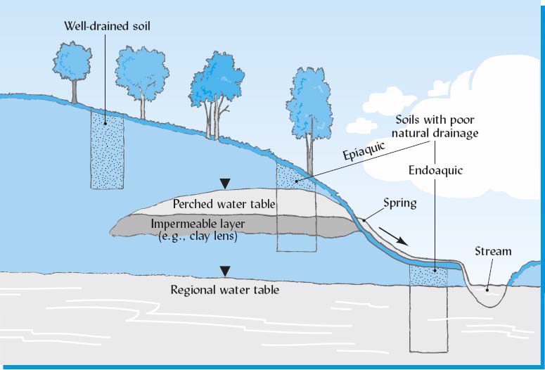 Cross section of a landscape showing the regional and perched water tables in relation to three soils, one well- drained and two with poor internal drainage. By convention, an inverted triangle identifies the level of the water table. The soil containing the perched water table is wet in the upper part, but unsaturated below the impermeable layer, and therefore is said to be epiaquic (Greek epi, “upper”), while the soil saturated by the regional water table is said to be endoaquic (Greek endo, “within”). Artificial drainage can help to lower both types of water tables. (Diagram courtesy of R. Weil)