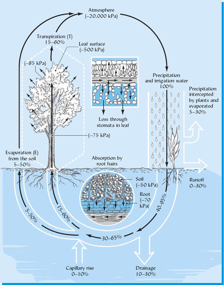Soil–plant–atmosphere continuum (SPAC), showing water movement from soil to plants to the atmosphere and back to the soil in a humid to subhumid region. Water behavior through the continuum is subject to the same energy relations covering soil water that were discussed in Chapter 5. Note that the moisture potential in the soil is – 50 kPa, dropping to –70 kPa in the root, declining still further as it moves upward in the stem and into the leaf, and is very low (–500 kPa) at the leaf–atmosphere interface, from whence it moves into the atmosphere, where the moisture potential is –20,000 kPa. Moisture moves from a higher to a lower moisture potential. Note the suggested ranges for partitioning of the precipitation and irrigation water as it moves through the continuum. Over 98% of the water absorbed by the roots of plants is transpired as water vapor over the course of the growing season. |