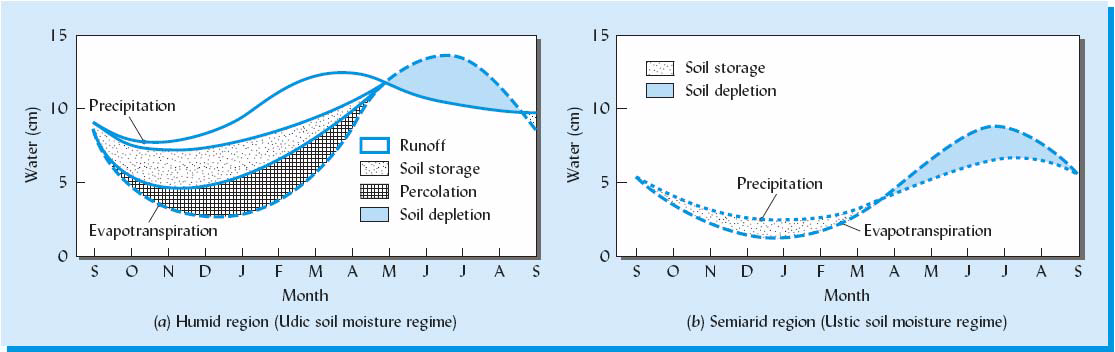 Seasonal water balance curves for two temperate zone regions: (a) a humid region and (b) a semiarid region. Note that actual ET shown is restrained by the water supply available. Potential evapotranspiration (PET), not shown, would be much higher, especially in (b). Percolation through the soil is absent in the semiarid region. In each case, water is stored in the soil and later released when ET exceeds precipitation.