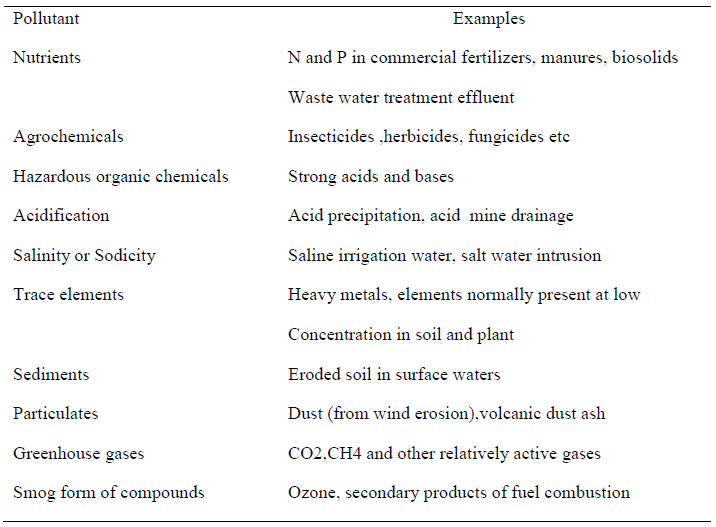 6.1 Preface: The term contaminant is often used synonymously with pollutant, although difference in the definitions would indicate that these terms are not interchangeable. Contaminant implies concentration of a substance is higher than would naturally occur but does not necessarily mean that the substance is causing any harm. However, pollution refers to a situation in which the concentration of a substance is higher than would naturally occur but also indicate that the substance is causing harm of some type. Therefore, a soil could be contaminated but not polluted. Pollution is often broadly categorized according to its source:
