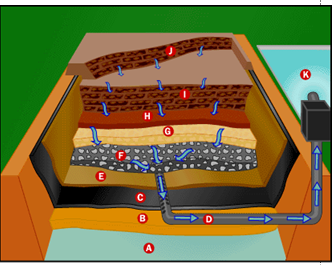 This cross-section drawing shows the structure of a municipal solid waste landfill. The arrows indicate the flow of leachate. |