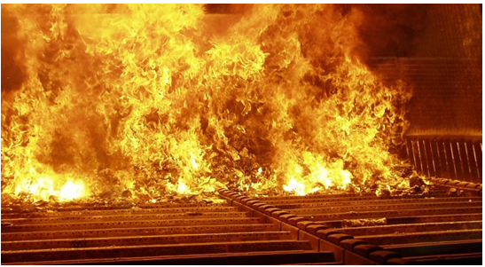 Municipal solid waste in the furnace of a moving grate incinerator capable of handling 15 metric tons (17 short tons) of waste per hour. The holes in the grate elements supplying the primary combustion air are visible.