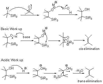 Peterson olefination, which is closely related to the Wittig reaction, can be carried out in two ways using either acid or base and the geometry of the alkenes can be controlled accordingly (Scheme 18) .