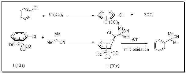 Arylchromium complexes prepared by heating Cr(CO)6 with arene have found use as a source of preparation of arene derivatives by attack of a nucleophile (Scheme 6). The rationale for this lies in the fact that arylchromiumtricarbonyl complexes follow 18 electron complexes and as such