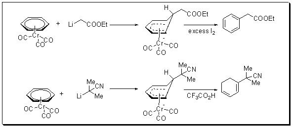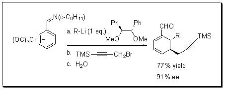 Asymmetric version of the reaction has been developed for the synthesis of functionalized cyclohexadienes form benzaldimine complexes and the conversion of ortho -substituted anisole complexes to give cyclohexanones (Scheme 9).
