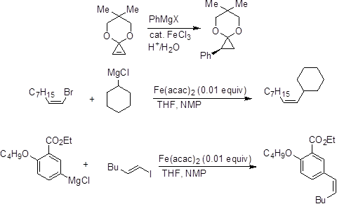 The Lewis acidity of iron(III) has been utilized for several reactions. These reactions mostly involve activation by co-ordination with heteroatoms or π-bonds. Bromination of aromatic compounds can be carried out by bromine in the presence of iron powder. Similarly, addition of catalytic amount of iron(III) salts facilitates the addition of organometallic nucleophiles (Scheme 2).