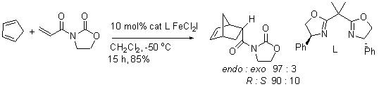 Chiral iron(III)- bis (oxazoline) has been used for the asymmetric (4+2)-cycloaddition reaction with good enantioselectivity (Scheme 9).